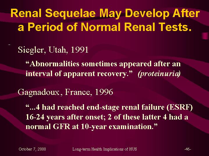 In France in 1996, a very large, long-term study found that four patients had reached end stage renal failure around 20 years or so after HUS and that two of these latter four had a normal GFR at their 10 year examination.