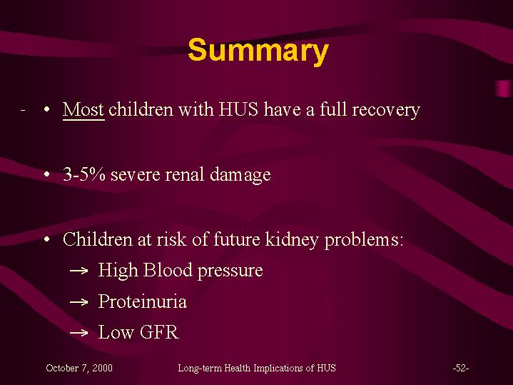 So in summary I think the big picture is that most kids who have HUS get better. The majority of kids have a full clinical recovery. Three to five percent, well, four percent have severe damage, have end stage renal disease within a couple of years, and you know who those patients are. Usually when they leave the hospital, the big question that's unanswered is, who are the children at risk of future kidney problems? Maybe those with high blood pressure, those with persistent proteinuria, and certainly those with a low GFR are at high risk. All children with HUS should have life-long follow-up to look for these problems developing.
